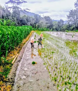 Dengan penuh semangat Babinsa juga mendorong semangat para petani dalam melakukan penanaman padi, mulai dari penyemaian bibit, pengolahan lahan sawah, perawatan sampai panen padi. Seperti saat ini yang sedang mereka lakukan ialah menanam padi di sawah milik Ibu Monsi Sinaga dengan Luas lahan 2 Rante